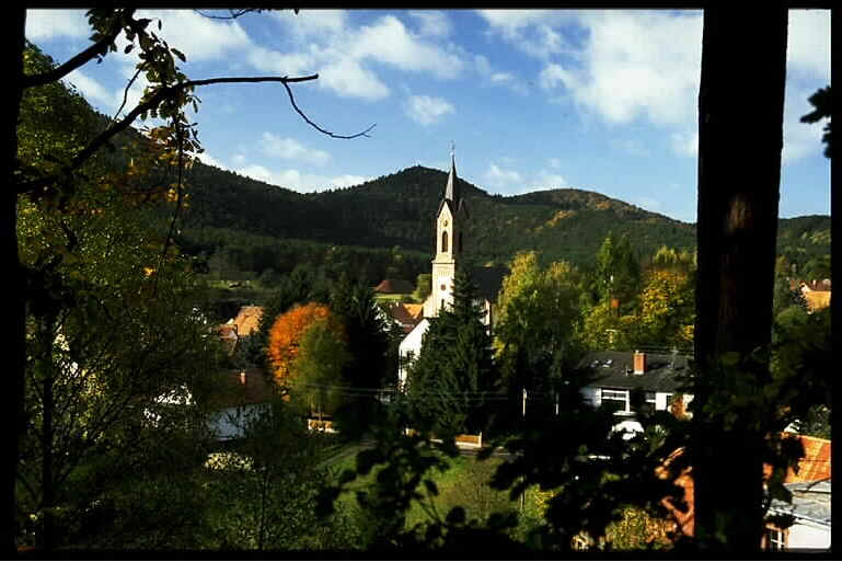 genannt, die mit ihrem 35 m hohen Glockenturm das Dorf